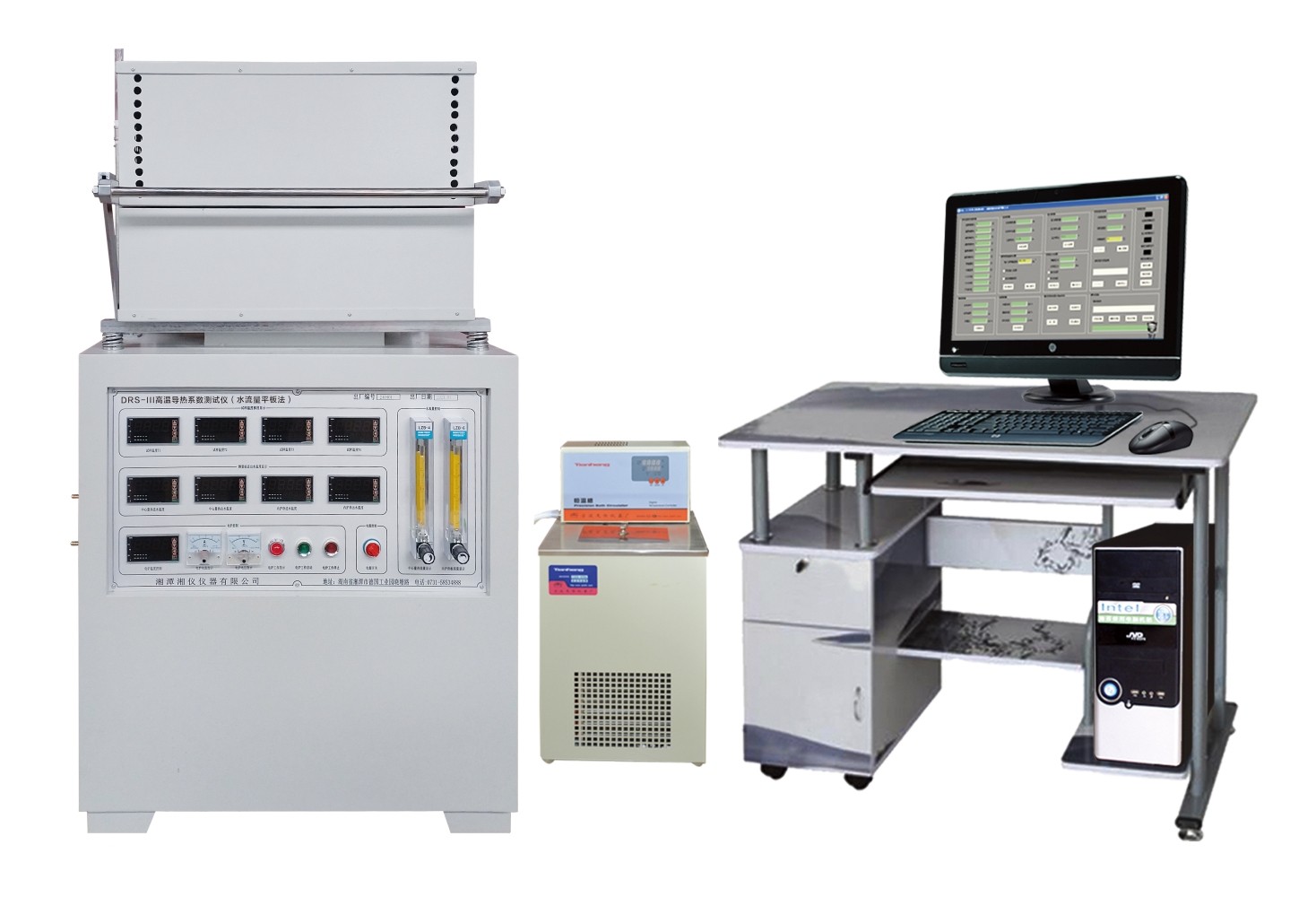 本测试仪基于YB/T 4130《耐火材料 导热系数试验方法(水流量平板法)》测试标准,参照标准的要求,设备主要由加热炉、电脑测控系统、恒压循环水系统、量热器系统等部分构成。